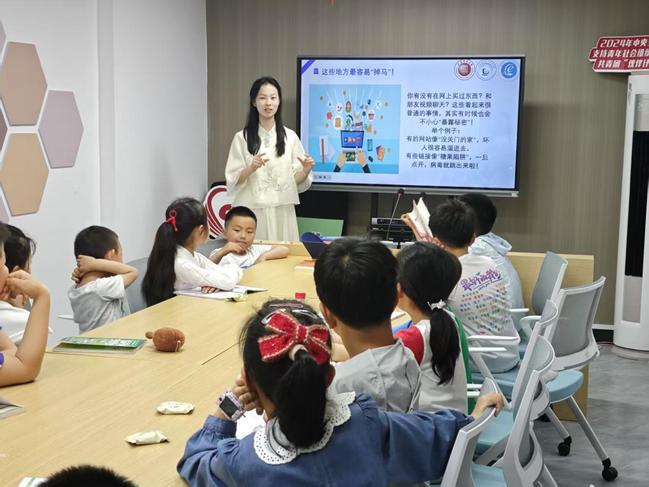 随后,“E路领航”网络素养培育工作室成员围绕《网络小卫士大冒险:保护我们的秘密王国》展开专题宣讲。她以读书会中提及的网络安全案例为切入点,系统讲解个人信息的构成与潜在风险,剖析公共Wi-Fi隐患、虚假链接诈骗等常见信息泄露途径,并手把手教授密码设置技巧、防病毒措施及网络诈骗识别方法。通过讲解《中华人民共和国网络安全法》《中华人民共和国个人信息保护法》,将法律条文转化为生动的网络素养培育“知识宝典”,将知识在“大手”与“小手”的桥梁间传递,有效强化了社区青少年的网络文明素养。