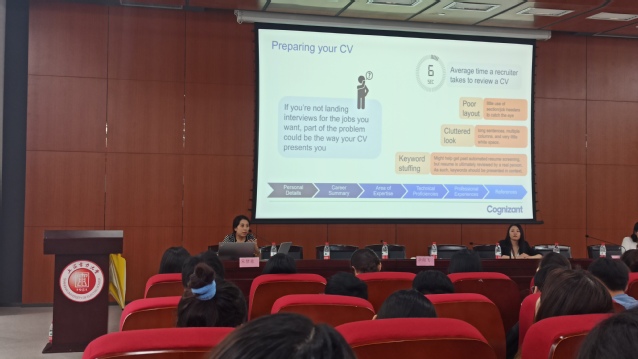 李正浩向员工分享了他在求职中的得与失,传授了求职中应该着重注意的经验,认为只有专业知识+行业知识才能组成一个完整的开发人员,希望学弟学妹们能够发挥优势找到理想的工作。高知特信息技术(上海)有限公司的HR朱梦希和倪亚萍,分别从企业人力资源和职场技能培训角度,讲解了毕业生简历的制作、面试应聘技巧以及求职技能准备等。