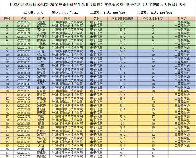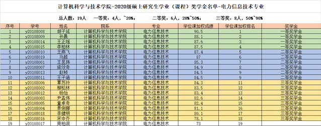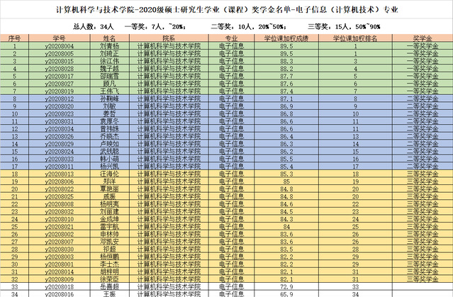 注:电子信息(计算机技术)专业三等奖分配名额为14,但因三等奖最后一名31名与后一名32名加权成绩相同,因此增加一个三等奖名额,三等奖人数为15人。