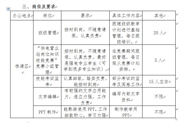 校团委和申电进修公司(即上海市国家电网培训中心)启动了一项暑期挂职锻炼,时间是7月12日―8月31日,具体工作岗位如图。