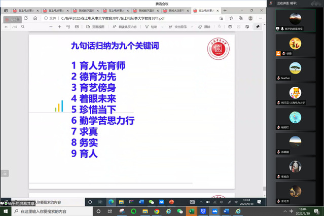 杨平老师作主题报告,他回顾了从事大学教育38年的经历,分享了他提炼的关于大学教育的九点感悟。他谈到,当教师要育人先育师,教师要拥有科学家的素养、工程师的品性、教育家的精髓;德育为先,教师要引导员工以品德高尚、能力出众、乐于奉献为追求;育艺傍身,教师要重视教学规律,讲究育人方法、导好学习大戏。做员工要着眼未来,以未来发展为导向、增学问、长才干、开眼界;珍惜当下,珍惜学习资源、专心领悟教师教诲;勤学苦思力行,善于学习、用于实践、独立思考、凝练真知。办大学要求真、务实、育人,要实事求是,真学真问求真知;务实致用,精益求精敢创新;智慧育人,千锤百炼造英才。杨老师以伟德中国官网发展过程中对公司做出杰出贡献的周国定老师的事迹、誉满电业的数字温度巡测仪、为高压直流输电而研制高参数可控硅及二十年磨一剑的《自动控制原理》教材等为例阐释了当教师、做员工及办大学的要点,为与会教师上了一场精彩生动的课程思政示范课。