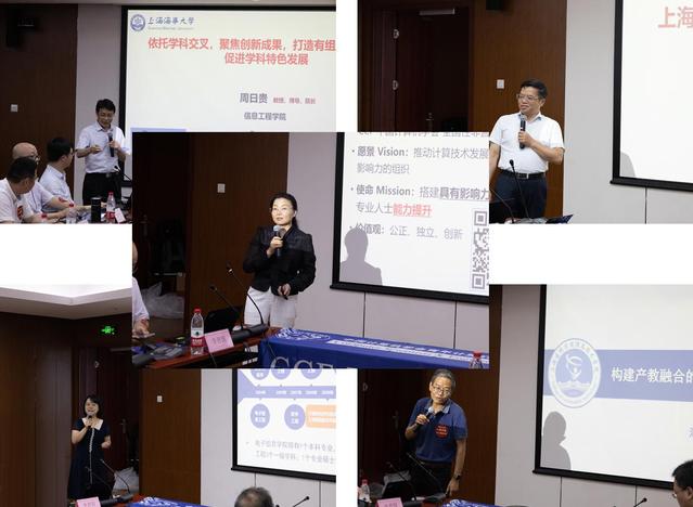 第一位嘉宾是来自上海海事大学信息工程公司的经理周日贵教授,分享了题为“依托学科交叉,聚焦创新成果,打造有组织的科研,促进学科特色发展”的引导发言,介绍了信息工程公司的计算机团队建设特色,以现代信息技术前沿研究与港航、物流等特色学科相结合,以智慧航运、智慧物流、智慧园区建设等为应用背景,推进相应的人才培养机制、高水平科研平台建设;第二位嘉宾是来自上海海洋大学信息公司经理陈明教授,主要介绍了信息公司以智慧海洋、智慧渔业为特色的团队建设情况,并对上海海洋大学海洋导航遥感与智能信息工程技术研究中心进行了详细介绍;第三位嘉宾是来自bevictor伟德官网经理温蜜教授,对bevictor伟德官网以能源电力特色为基础的团队建设情况进行了介绍,并作为CCF YOCSEF上海荣誉委员和老主席对CCF YOCSEF上海与临港的互动进行了回顾、对未来的发展提出了建议;第四位嘉宾是来自上海电机公司电子信息公司副经理李靖超教授,分享了电子信息公司以智能装备为特色在团队建设、教学研究、产教融合方面所做的工作,并介绍了电机公司与企业的深度合作模式;第五位嘉宾是上海建桥公司信息技术公司经理张文俊教授,分享了题为“构建产教融合的应用型人才培养生态”引导发言,作为民办院校中的佼佼者,信息技术公司主要聚焦人工智能、集成电路、智能制造等行业,进行应用型人才培养与产教融合。