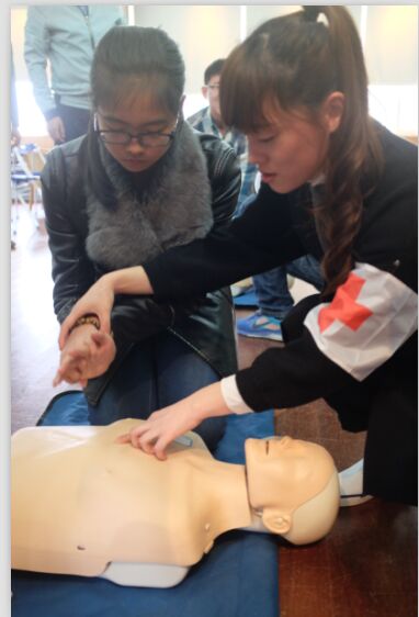讲座由浦东医院普外科主治医师、浦东医院红十字救援队骨干成员、浦东医院院级优秀人才余伟平主讲。余医生由“猝死”做引子讲解了心脏骤停的常见原因,强调在发现患者晕倒的4~6分钟内必须采取诸如“呼喊轻拍确定有无意识”、“ 观察判断有无呼吸”、“及时拨打求救电话”和“触摸颈动脉确定心跳情况”等急救措施,尤其指出要在专业医生到来之前采取及时的心肺复苏。浦东医院医务团队结合人体模型现场演示了心脏按压的部位、频率、幅度以及按压与通气比,并对现场师生实际操作进行了指导。