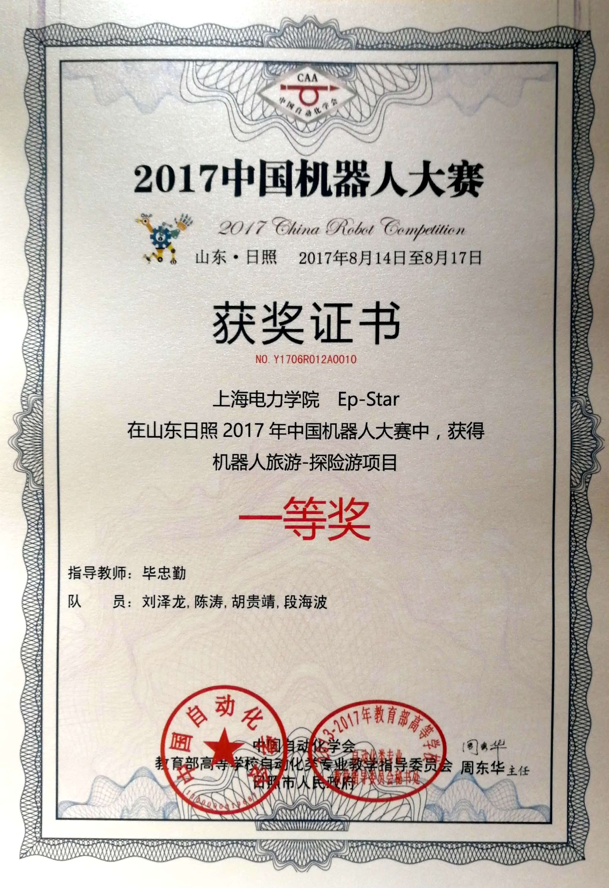 8月14日至18日,由中国自动化学会、山东省日照市人民政府主办的“创泽信息杯”2017中国机器人大赛在山东体育公司举行,由公司机器人实验室成员刘泽龙、胡贵靖、陈涛、段海波、王知涵组成的EP-star代表队在毕忠勤老师的指导下,积极备赛,在激烈的角逐中闯关过将,最终夺得机器人旅游-探险游项目全国一等奖。