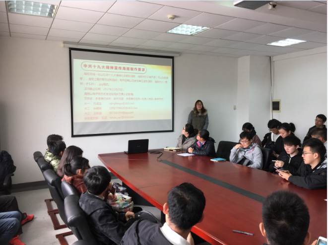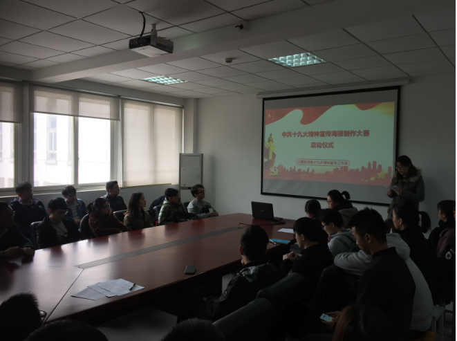 首先,负责人贺文婷同学就海报制作的要求进行了介绍,告知每个班级需要完成一张以弘扬十九大精神为主题的海报,并在截止日期之前提交给相关负责人。随后,余书记对活动进行了补充说明,她强调此次海报设计大赛非常重要,希望同学们可以看到设计海报工作背后的意义,认真学习十九大相关精神,加强自身思想政治建设,让同学们通过此次制作大赛来走近十九大,深入学习、贯彻、落实党的十九大精神,提升班级同学的政治意识,为国家、社会做出自己的贡献。