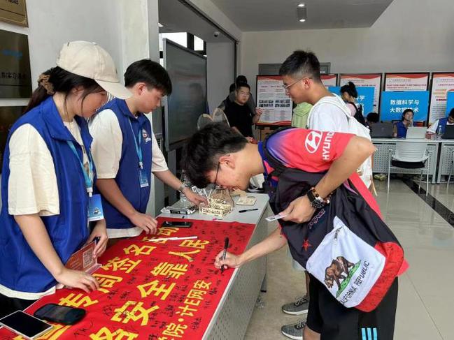 9月11日新生报到当天,结合2023年国家网络安全宣传周的主题“网络安全为人民、网络安全靠人民”,在计电楼开展网络安全签字活动,新生在报到的同时了解网络安全知识,签名承诺共同筑牢网络安全防线。大家纷纷表示:共建网络安全,共享网络文明,是每一个人的责任,万物互联,我们要做好自我防护,提高安全防范意识。