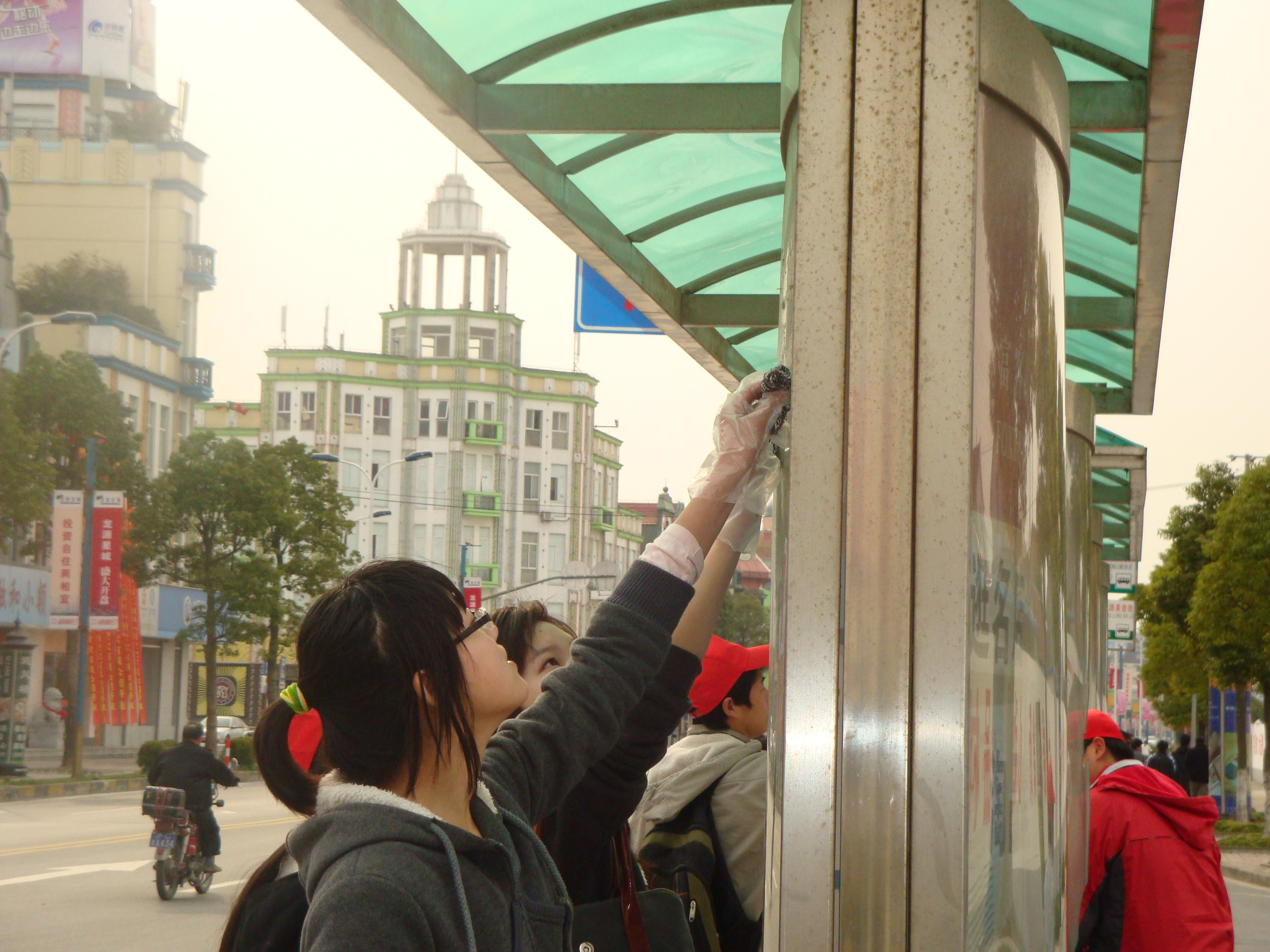,2008112团支部的同学们戴着小红帽,顶着烈日,拿起钢丝球擦拭公司周围和南汇大学城人民东路沿途3公里公共设施上的小广告。他们从身边的小事做起,为上海举办世博会贡献自己的力量。雷锋精神是我们中华民族宝贵的精神财富,它激励着一代又一代的青年健康成长,促进社会文明的进步,积极为上海世博会做贡献。