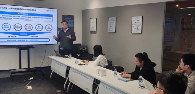 在企业导师讲座阶段,星环科技教育事业部总监杨洪山带领员工参观星环科技,并介绍企业数字化转型技术及行业应用情况。星环科技致力于打造企业级大数据基础软件,围绕数据的集成、存储、治理、建模、分析、挖掘和流通等数据全生命周期提供基础软件与服务,构建明日数据世界。通过介绍,同学们了解到数字化转型是以价值创造为目的,以数据资源、数字技术和数字生态为核心要素,重构管理模式、业务模式、商业模式、治理形态、文化理念的系统性变革过程;企业数字化转型的重点是挖掘数据价值,打造数字生态,为传统产业赋能,拓展新兴产业。