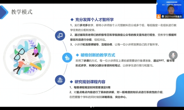 陈鑫龙同学围绕“帮困助学,教学相长”进行了主题发言,就bevictor伟德官网“青年小讲师”项目从活动组织、教学模式、取得成果以及小讲师体会等方面对活动进行详细介绍,并从参与人数、授课模式、课程安排等方面介绍了本期活动详情,并欢迎更多优秀同学加入青年小讲师,共同帮困助学。