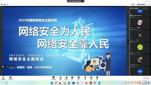 营造清朗空间,主题班会“云研讨”。公司结合今年国家网络安全宣传周主题“网络安全为人民 网络安全靠人民”开展线上主题班会,组织员工交流、研讨目前国内外网络安全形势、网络安全案例及安全防范方法等。针对科技安全,员工进行了深入的交流讨论,指出依靠科学技术,提高综合国力才是提升科技安全的重要手段。此外,各专业、各班还立足近期疫情形势,结合疫情期间暴露出的国家安全事件,以公共卫生安全、生物安全等为重点内容,在员工中开展宣传教育。员工们结合疫情期间的感悟,碰撞思维火花,激扬当代老员工维护国家安全的青春风采。