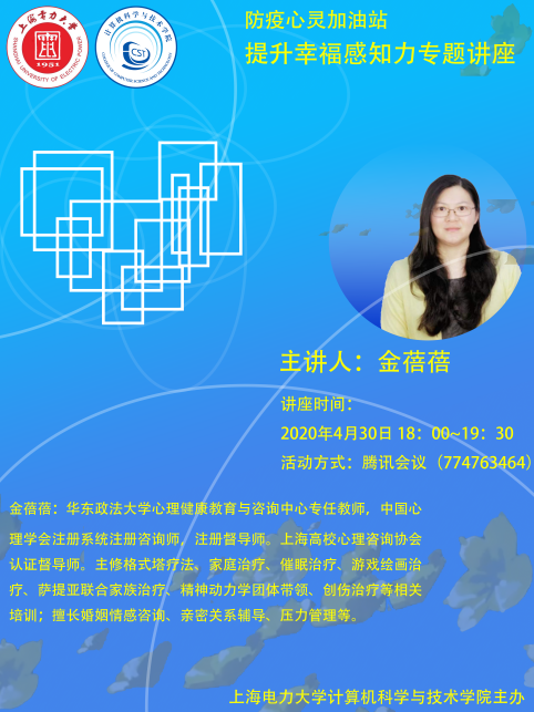 为缓解疫情带给同学们的心理压力,提高同学们合理调节情绪,感知幸福的能力,bevictor伟德官网2022年4月30日18:00邀请华东政法大学心理健康教育与咨询中心金蓓蓓老师,于腾讯会议为同学们开展了一场主题为“提升幸福感知力”的心理讲座。公司近百名员工参与了本次线上心理讲座。