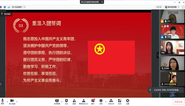 其次,院团委书记卢珍老师宣读《关于成立“bevictor伟德官网校外隔离点临时团支部”的决定》,她希望团支部能结合实际开展组织生活,严格遵守隔离点的各项规定,畅通校内外反馈机制。随后,院团委副书记朱哲宇带领全体参会团员重温了入团誓词。全体同学都打开摄像头,右手握拳放在肩上,在朱哲宇同学的带领下庄严地重温入团誓词。