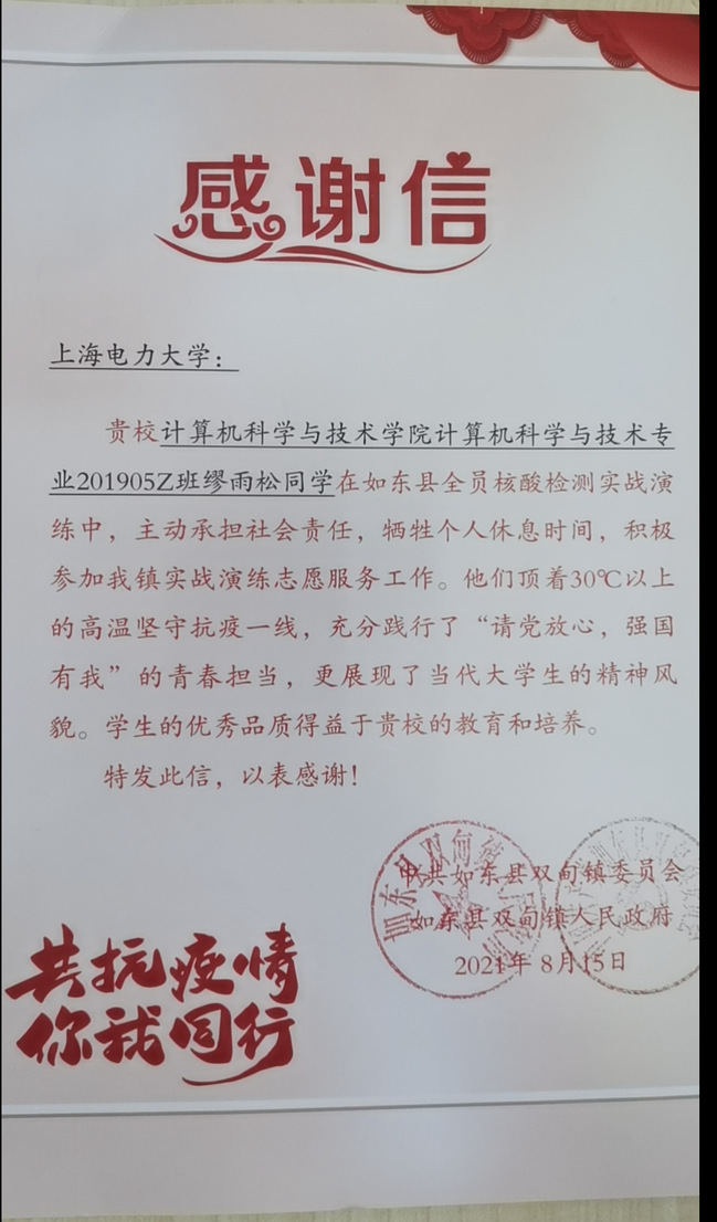 2021年7月,自南京禄口机场发现新冠肺炎确诊病例以来,病毒迅速蔓延,整个江苏省疫情防控管理升级,面对新冠肺炎疫情期间家乡抗疫压力大、任务重、人手紧张的局面,缪雨松同学利用暑假在家休息时间主动请缨,为家乡抗疫工作提供志愿服务、贡献青春力量。