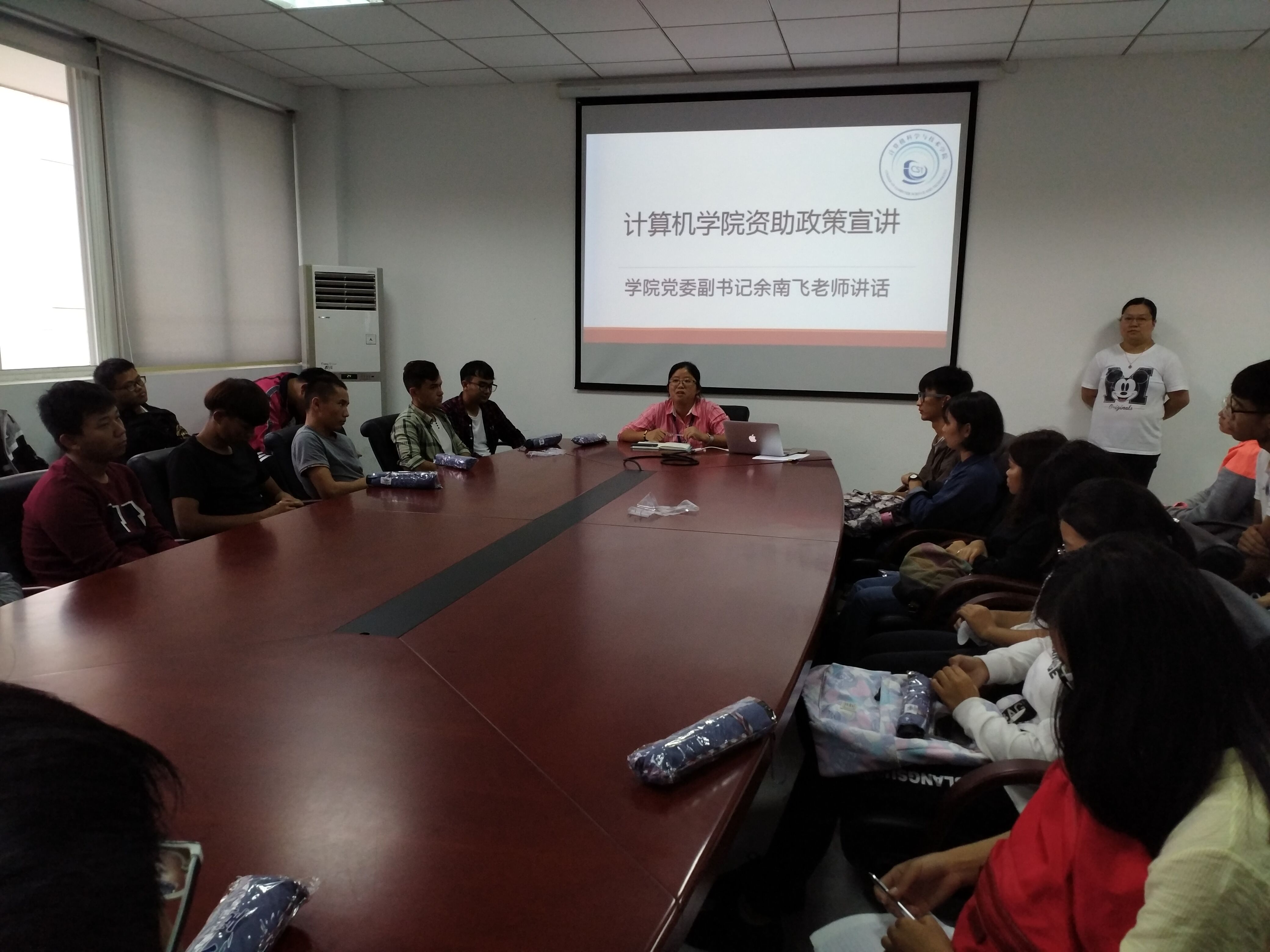 9月25日下午4点,公司资助政策宣讲会在行政楼209教室召开。参加本次宣讲会的有公司党委副书记余南飞老师,辅导员吴涵老师,老生代表上海市奖学金获得者刘泽龙同学,以及2017级参加本年度家庭经济困难认定的新生们。