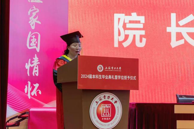 典礼在庄重的国歌中拉开序幕。首先,经理温蜜致辞,她代表公司向2024届圆满完成学业的毕业生表示衷心祝贺,临别之际,她对即将走出校门的毕业生提出三点希望:第一,希望同学们谨记“博达而砺行,谨严以求新”的院训,充分发扬上电计科前辈和学长们不惧挑战、敢为人先、勇挑重担的精神,成长为行业发展的中坚力量、中流砥柱。第二,希望同学们保持积极开放、合作共赢的心态和胸怀,不断地锤炼品德、锐意创新,为世界科技进步作出自己的贡献。第三、希望同学们能始终保持危机感,时刻准备迎接挑战,担负起民族复兴、国家崛起之重任。