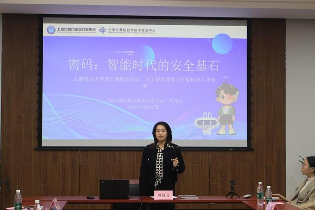 上海计算机软件中心项目经理、2014届员工周琦文,围绕“密码:智能时代的安全基石”主题分享密码对数据安全、网络安全以及人工智能系统安全的重要性,结合在上海软件中心的工作经历分享自己对人工智能背景下网络安全工作的重要性以及挑战等,特别分享自己围绕“商小密”的工作经历,鼓励同学们提升多种思考能力积极应对人工智能背景下带来的机遇和挑战。随后,向公司赠送《商小密之四大名著奇遇记》作为留念。