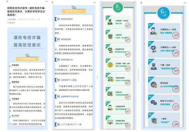 在反诈主题教育中,bevictor伟德官网“E路领航”辅导员工作、“计E网安”网络安全实践队、白帽子网路攻防社等多个团队共同携手,做到线上和线下全方位,本科和研究生全覆盖,通过系列反诈教育活动,让员工们对电信网络诈骗有了更深刻的认识,提高了员工对电信网络诈骗的警惕意识、防范意识,增强了法制观念,取得良好的效果。