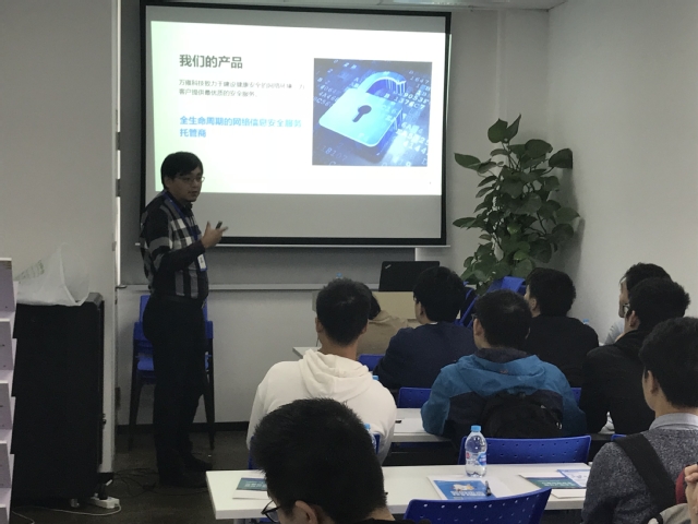 万雍科技人事主管范新芬女士带领大家参观了公司的办公环境,700平米开放式办公大厅,精致的休闲小间,给大家带来了不一样的感官,并向大家系统介绍了万雍作为全生命周期的网络信息安全服务托管商是一个怎样的企业,详细解读了其企业价值观、用人标准和服务理念;副总经理李秉先生为大家分析了信息安全发展的现状、前景以及所面临的挑战,详细介绍了其产品的优势、服务对象的特点、工作技能的要求以及个人发展前景等,并向同学们热情地抛出橄榄枝;技术主管向同学们收取简历,安排工作人员进行面试。活动期间余南飞与企业高层进行了交流,对人才培养和“产学研”结合达成共识,为后续交流打下基础。
